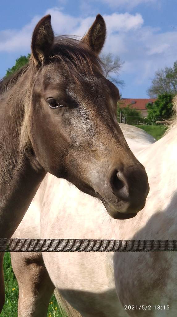 Sa robe crème et ses yeux bleu font d’elle un poulinière transmettant des robes uniques à ses poulains et un caractère très proche de l’homme.